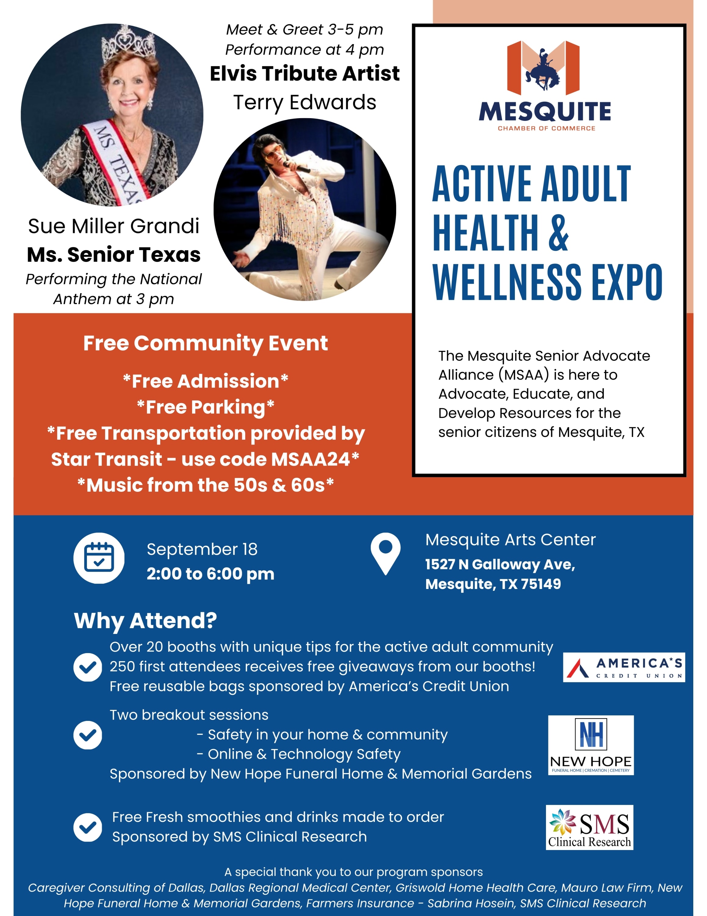 The Mesquite Senior Advocate Alliance is presenting an Active Adult Health & Wellness Expo for citizens of Mesquite. Join us for a special afternoon dedicated to the well-being of our Active Adult Community. This expo is the perfect way to explore the resources, services and tips that MSAA businesses have to offer. Come out and enjoy an afternoon dedicated to your well-being.
